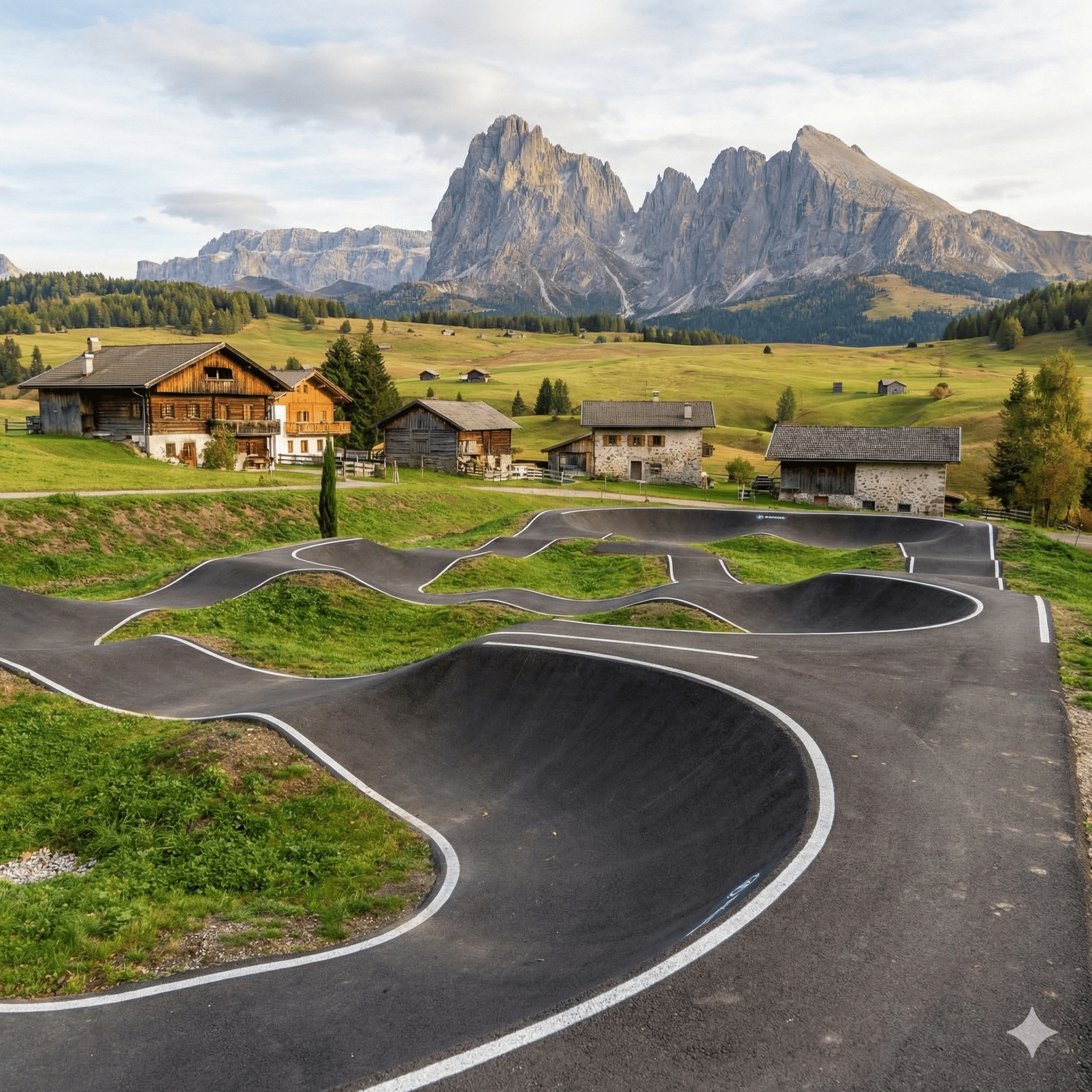 Moderno bike park con piccola pista pump track per bambini, ragazzi e famiglie. Un luogo dedicato al movimento, al divertimento e all'incontro che rafforza lo spirito di comunità, la salute e l'attrattiva del nostro comune.